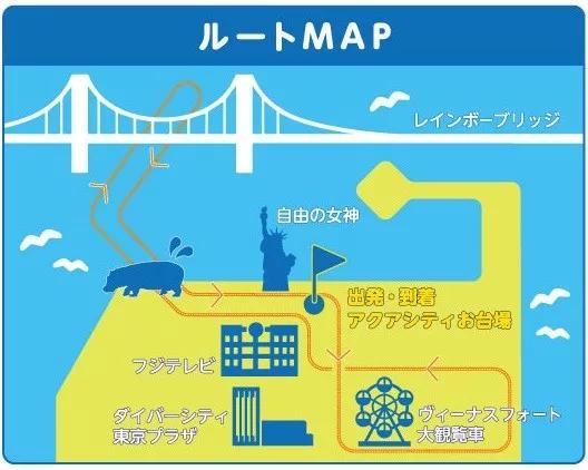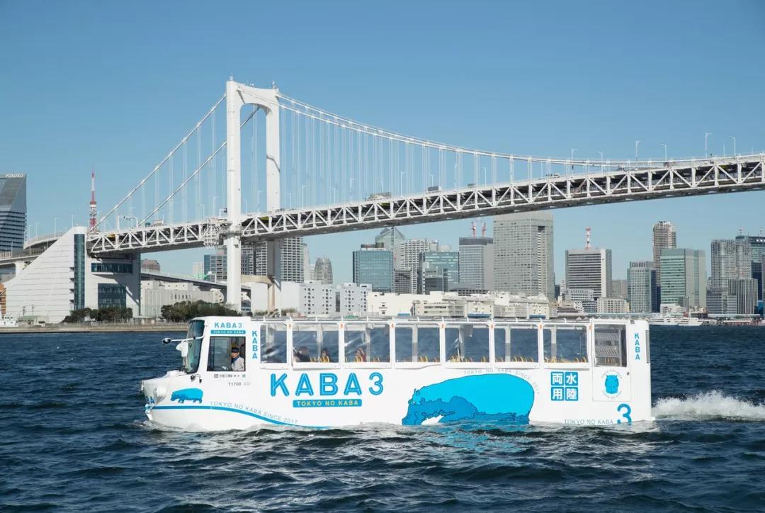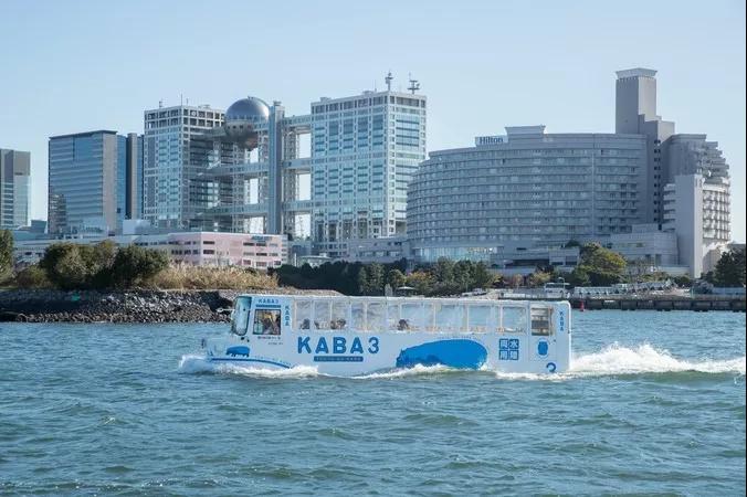 水陸兩用巴士TOKYO NO KABA,全長約12m,從臺場AQUA CITY的巴士站出發(fā),一天有7班,每周三休息。該巴士可供38名游客乘坐,可以坐在上面一邊吹著海風(fēng)一邊觀賞臺場的美景。需要提前一個月預(yù)約,如果當(dāng)天有空位,沒有預(yù)約也可以乘坐。