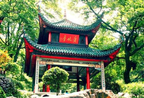 愛晚亭,位于湖南省岳麓山下清風峽中,亭坐西向東,三面環山。始建