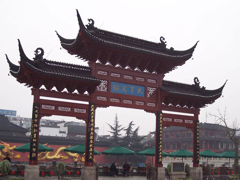 秦淮河是古老的南京文化淵源之地,而內秦淮河從東水頭至西水關全長4.2公里的沿河兩岸,從六朝起便是望族聚居之地,商賈云集,文人薈萃,儒學鼎盛,素有“六朝金粉”之譽。自六朝至明清,十里秦淮的繁華景象和特有的風貌,曾被歷代文人所謳歌。 夫子廟位于秦淮河北岸,原是祀奉孔子的地方,始建于宋代景祐元年(公元1034年),是就東晉學宮舊址擴建而成。元代為集慶路學,明代為應天府學,清代將府學 遷至城北明國子監舊址,這里便成為江寧、上元兩縣縣學。咸豐年間毀于兵火,同治八年(公元1869年)重建。抗日戰爭時被日軍焚毀。古時立學必祀奉孔子,其各地的孔廟,屬于國家祀典內容之一。所以孔廟的特點是廟附于學,和國學、府(州)縣學聯為一體。廟的位置或在學宮的前部,或偏于一側。