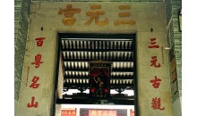 廣州三元宮是嶺南現存歷史較長、規模較大的道教建筑。據史書記載為東晉時南海太守鮑靚所建,明代萬歷年間重修時始稱三元宮。三元宮坐北朝南,在越秀山南麓,依山而建,漸次升高,現存各殿堂建筑總面積約2000平方米,布局以正對山門的三元殿為中心,殿前拜廊,東西連鐘鼓樓。大殿后為老群殿,大殿兩側自南向北,東側為客堂、齋堂、舊祖堂、呂祖殿;西側缽堂、新祖堂、鮑姑殿等建筑。