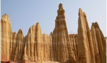 虎跳灘土林位于元謀縣城西北32公里的物茂鄉(xiāng)虎溪行政村,又稱物茂土林,芝麻土林,總面積2.3平方公里?;⑻鵀┩亮中螤钜猿潜睢⑵溜L狀、簾狀為主,高度一般10?15米,最高27米。