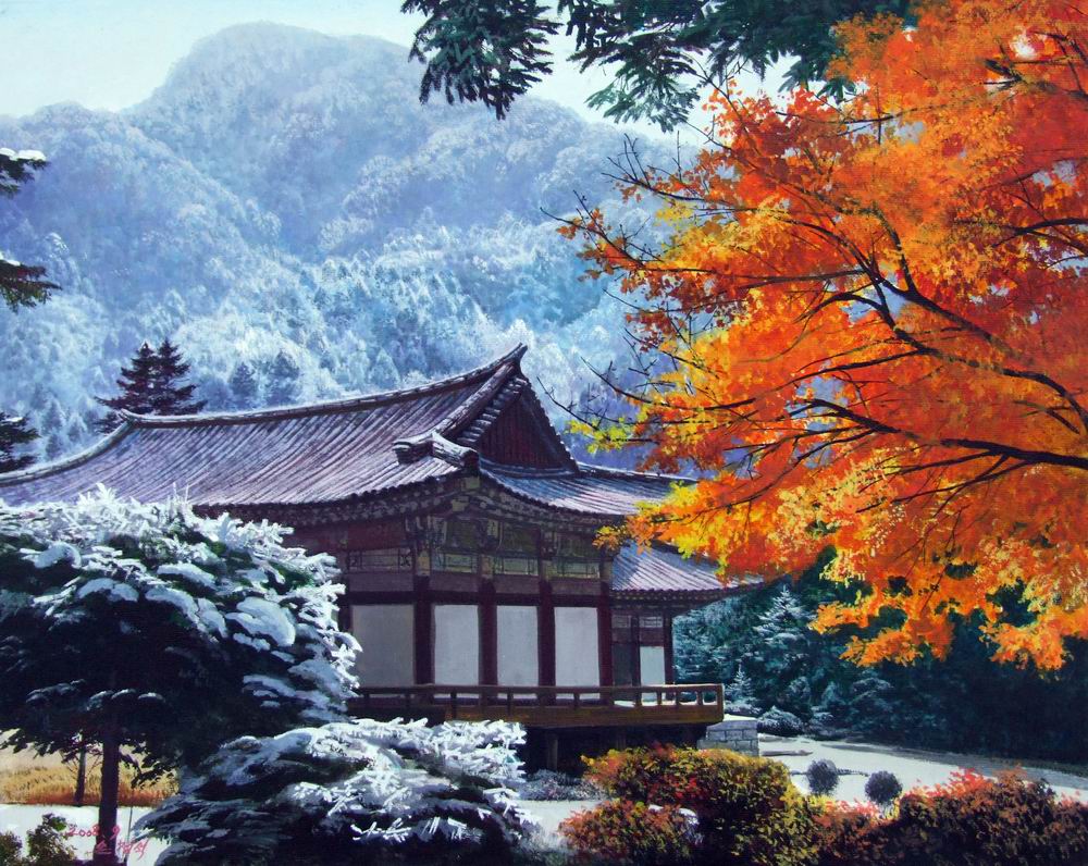 坐落在通往妙香山路旁的普賢寺,建于公元1014 年,寺前有冷杉、海松、水曲柳等多種樹木。寺內主要建筑物有大雄殿、萬歲樓、解脫門、天王門以及一座四角的9 層塔、一座八角的13 層塔。大雄殿的墻壁很高,歇山式屋頂,仿流線型的粗腰房柱,神妙雕塑的裝飾,顯得和諧、端莊。殿內保存著13世紀刻印的6780 卷佛教大經典,