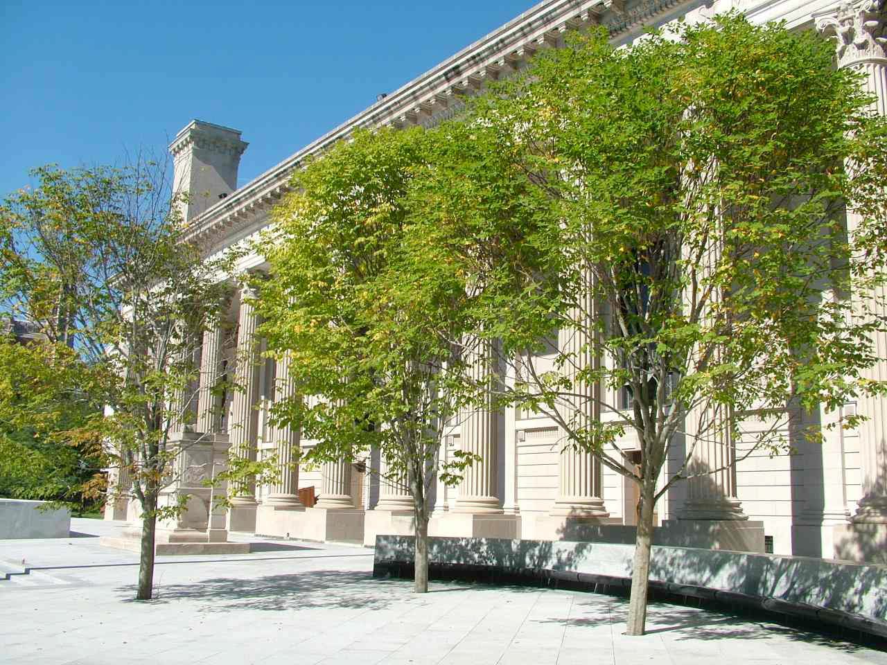 Beinecke古籍善本圖書館由Gordon Bunshaft設計,是當今世界上最大的專門收藏古籍善本的圖書館。它坐落于休伊特庭院的旁邊(現在多被稱作Beinecke廣場)。圖書館地面以上六層的書庫由一個玻璃的立方體環繞,而玻璃立方的外面則有一個更大的與之不接觸的“盒子”罩住。這座建筑的墻壁是由兩英尺見方的產自佛蒙特州的半透明大理石構成,因此可以使館內微亮而防止陽光中的其他有害射線破壞館藏圖書。版權所有山東聊城聊之旅國際旅行社有限公司,轉載必究!廣場中一個下沉式庭院中的雕塑由Isamu Noguchi設計,代表了時間(金字塔)、太陽(圓環結構)和機率(斜立的立方)。