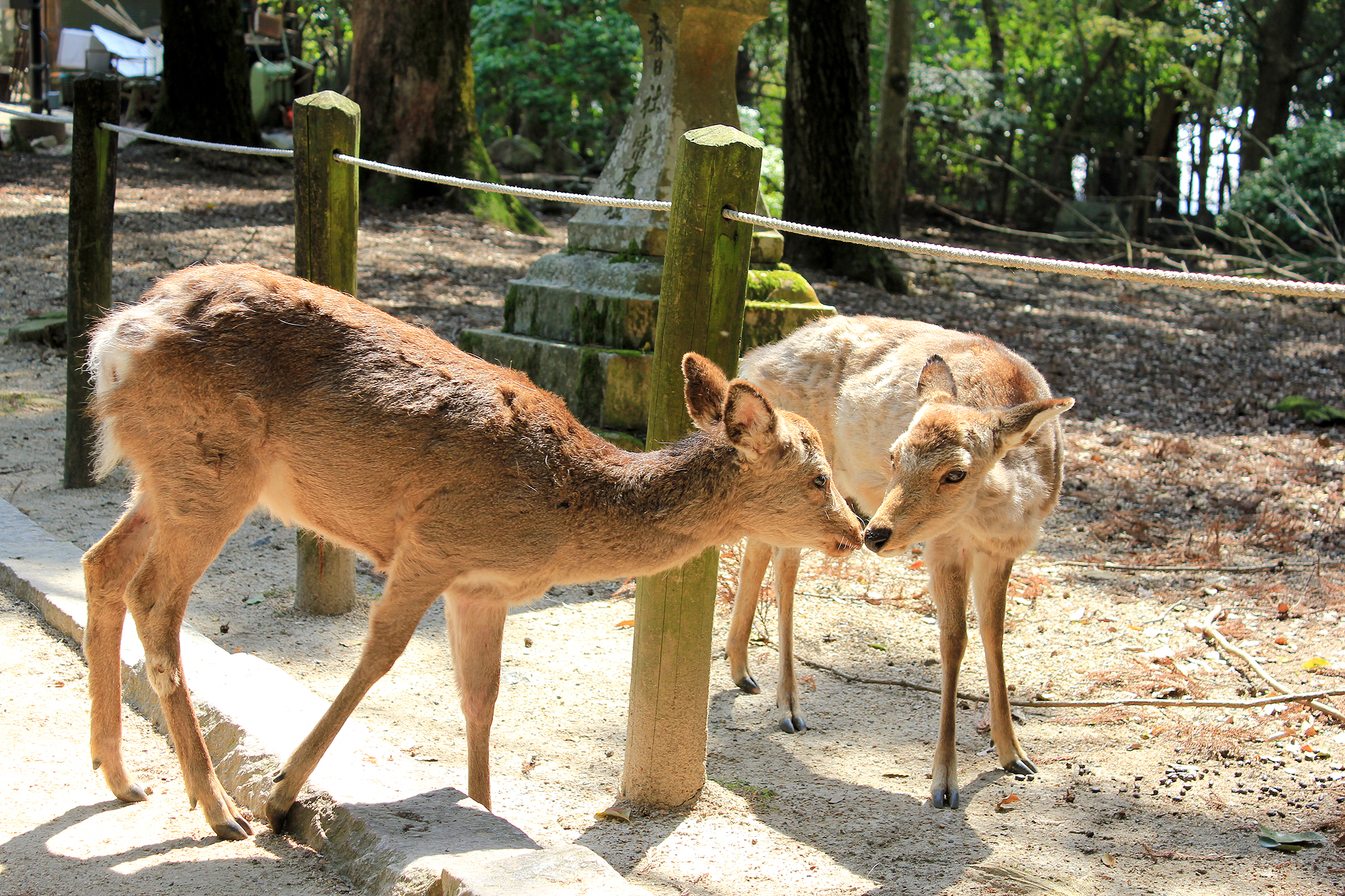 成群嬉戲于公園里的鹿,因與春日大社流傳的白鹿傳說有關而受到保護,且被指定為國家的自然保護動物。享受這美麗的大自然最好是在碧綠的若草山和鹿毛色美的4、5月,或是滿山紅葉的秋天等出游行樂、畢業旅行的季節。但是,在淡季時您可悠閑自在的在此散步。一年四季無論何時,這里都有吸引人的景觀。