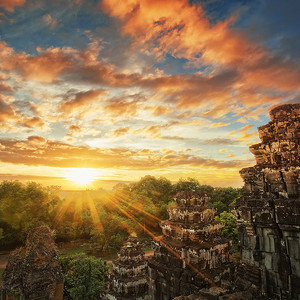 巴肯寺正對羅洛寺建筑群,它建造在吳哥古都附近的一座孤立的山上。位于吳哥城外南面,原為都城的中心,臺基為金字塔式的五層,各層有塔,層層而上,極為壯觀。在山頂可以俯瞰吳哥窟全景、吳哥古都和周圍的景點,是看日出和日落的最佳地點。