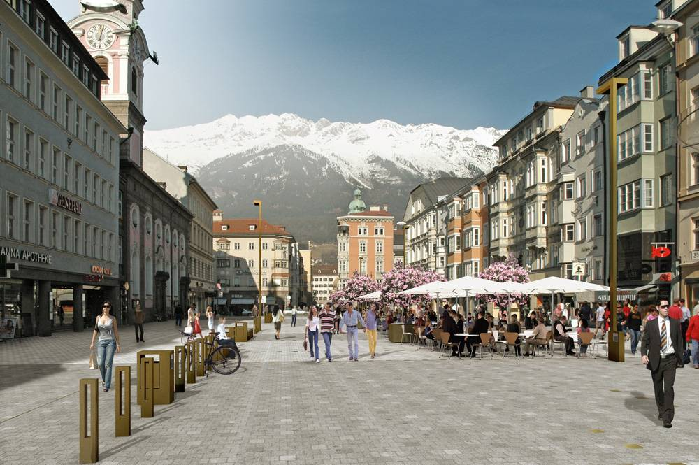 因斯布魯克建立于1239年。這座美麗的小城坐落在阿爾卑斯山谷之中,旁邊流淌著因河。 奧地利的高山,就跟她的音樂一樣,是世界知名的。蒂洛爾州則是阿爾卑斯山的心臟。無論是在因斯布魯克的哪一個(gè)角落,都能見到白雪覆蓋的山巒。因?yàn)楸泵姹簧矫}遮擋,所以因斯布魯克氣候宜人,是國際旅游的勝地。