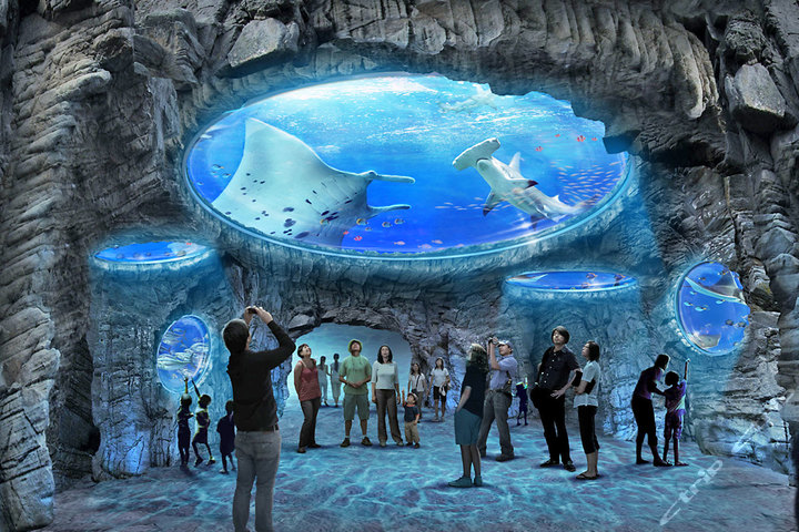 海洋館是世界最大的水族館之一。水體寬22米,長38米,水深達7米,分為4層,觀眾可由通道環繞參觀。該館按珊瑚礁布局,分深湖和瀉湖兩部分:深湖依據堡礁設計,瀉湖參照緣礁摹造,兩湖海水相通。館內放養了太平洋島嶼及南中國海魚類5000多條,約400多種,從體長不到2厘米的鹽雀鯛到身長3米的豹紋鯊,還有海鰻、神仙魚、石斑魚等各種珊瑚礁魚類。該館還設有“珊瑚和珊瑚礁”展覽,介紹有關珊瑚礁的形成。