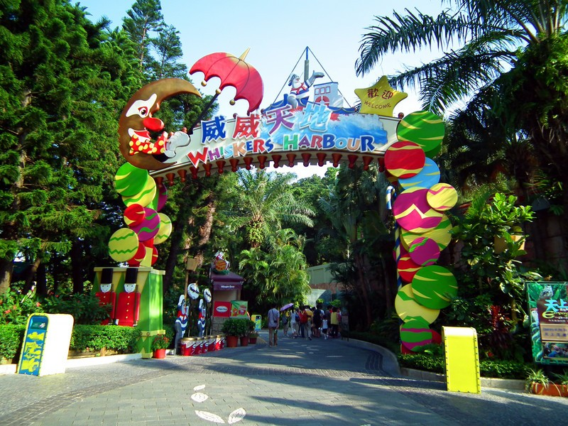 公園有前后兩個入口,從公園的正門進入會首先經過鯨豚保護廣場,繼而到達綠野花園及兒童王國,再乘坐纜車就可以到達山上的機動游戲區;如果從后門口大樹灣的入口進去,則會通往集古村,乘登山電梯再經過急流天地,便可達到山上的機動游戲區。從后門入園(大樹灣的入口)進去可以避開人群,逆向而行。