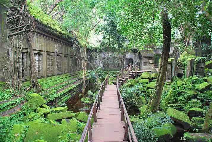 崩密列的護城河長1.2公里,寬0.9公里,它和吳哥寺幾乎一樣大的規模,但依然被叢林嚴密包裹著。由于比較荒僻,所以很多浮雕和塑像已被掠奪,但寺廟的神秘氣氛仍舊在森林深處彌漫。