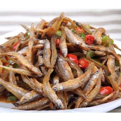 原料:小干魚100克、紅辣椒50克、油、鹽、姜、醬油適量