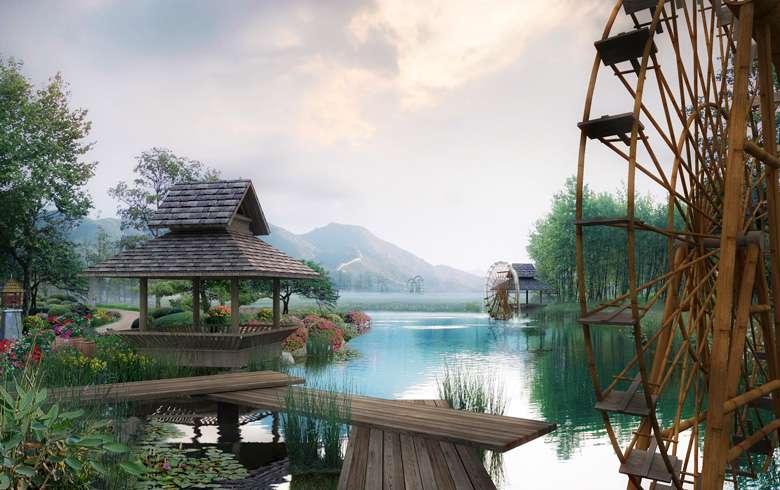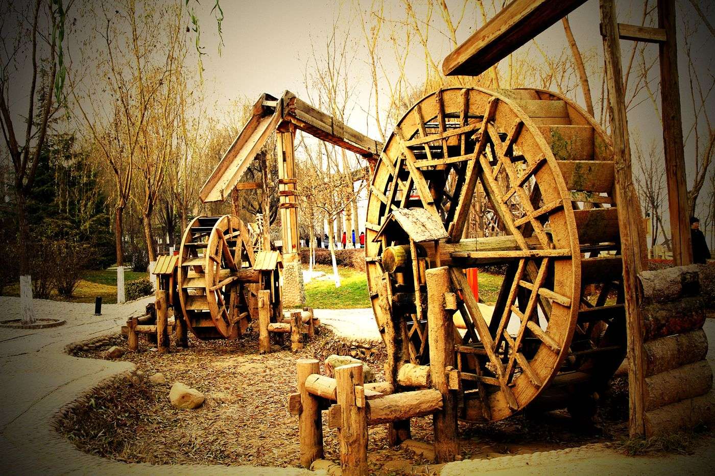 在水車廣場展現(xiàn)著各具特色的水車:在我們左側(cè)的是一架推水車(又稱水掛子),它依靠人力推動水車,將水提起,傾人水渠,灌溉農(nóng)田;在我們右側(cè)的是一架腳踏水車,其原理是用力踩動木輪,由傳動鏈條帶動水車,達(dá)到提水灌溉的目的;