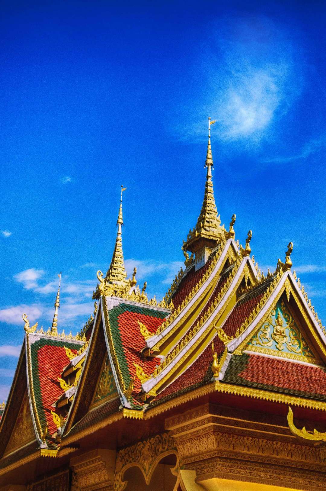 西雙版納傣族佛寺建筑,以重檐多坡面平瓦建筑為主。佛寺大多成方形,坐西朝東,屋頂坡面由三層相疊而成,中堂較高,東西兩側(cè)遞減,交錯(cuò)起落。屋頂使用長(zhǎng)方形片瓦,瓦尾鉤在平形的竹制橫椽之上。屋頂正脊及檐面之間的戧脊,用石灰抹平,上面排列各種瓦飾。正脊上的那瓦飾呈火焰狀,戧脊首端大多豎有鳳的形象,風(fēng)格獨(dú)特。各佛寺佛殿內(nèi)部由佛座、僧座和經(jīng)書(shū)臺(tái)3部分組成。佛座上塑的釋迦牟尼像,大多是坐像,佛祖的耳朵奇特,又大又寬,成“<”形。身材瘦削,眉清目秀,雙手扶膝,流露出一種神秘的氣氛,使人產(chǎn)生對(duì)傣族歷史追溯的好奇心。