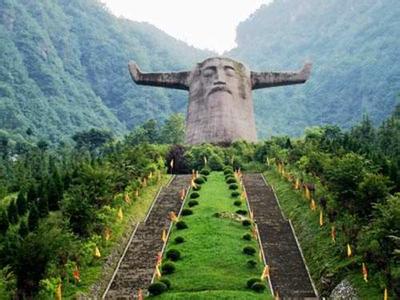 神農(nóng)祭壇的主體建筑是神農(nóng)巨型牛首人身雕像,此像高21米,寬35米,相加為56米,以示中華56個(gè)民族緊密團(tuán)結(jié),欣欣向榮。雕像立于蒼翠群山之間,以大地為身驅(qū),雙目微閉,洞察秋毫,似在思索宇宙。祭祀?yún)^(qū)內(nèi),踩在腳下的是代表天和地的圓形和方形圖案,在代表地的方形圖案中,五色石分別為五行學(xué)說中的金、木、水、火、土。近處,高10米的圖騰柱分別立于祭壇的左右兩邊,柱上的大小牛首以示神農(nóng)氏為牛首人身,子孫后代繁衍之意。圖騰柱的前方有兩幅大型浮雕,展現(xiàn)了神農(nóng)氏一生的豐功偉績(jī)。兩幅浮雕之間設(shè)有九鼎八簋(古時(shí)人們用以煮盛的物品,現(xiàn)為中華民族的最高祭祀禮器)和鐘鼓樓以供炎黃子孫在此祭拜先祖,尋求庇佑。登高343級(jí)臺(tái)階,便來到了雕像前的瞻仰臺(tái)(古時(shí)為天子祭禮,瞻仰的地方)。