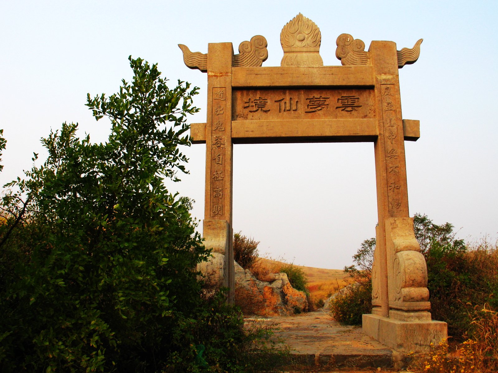 到云夢山,首先映入眼簾的就是南天門。南天門在云夢盆地埡口的南山峭壁下,就山崖的鐘乳石而建,上下兩層,由四根柱石構成,形似大門。上層是鐘乳石自然形成的一尊白衣觀音。整個門洞全由石料構成。故有這樣的歇后語:南天門的過木——干板硬正。南天門東側,就石鐘乳雕成的一條巨龍,翹首張目,望看觀音,似乎在聽觀音的吩咐,時刻準備把吉祥降到人間。