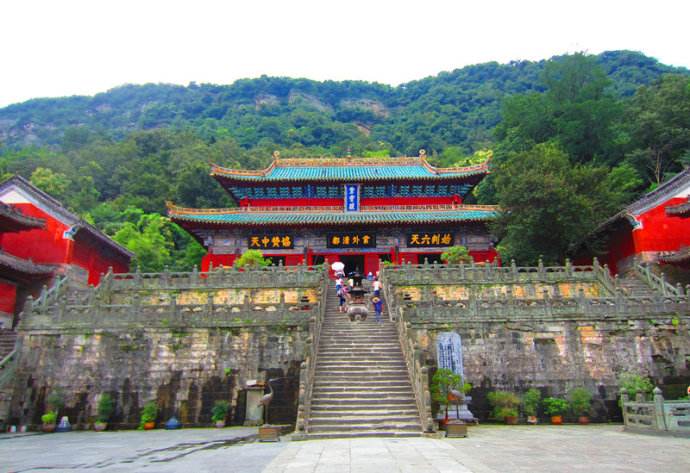 紫霄宮,又名“太元紫霄宮”,明代宮觀建筑,位于湖北省十堰市丹江口市境內的武當山。紫霄宮坐落在武當山的主峰——天柱峰東北的展旗峰下,占地面積約27.4萬平方米。面對照壁、三臺、五老、蠟燭、落帽、香爐諸峰,右為雷神洞,左為禹跡池、寶珠峰。周圍山巒天然形成一把二龍戲珠的寶椅,明永樂皇帝封之為“紫霄福地”。