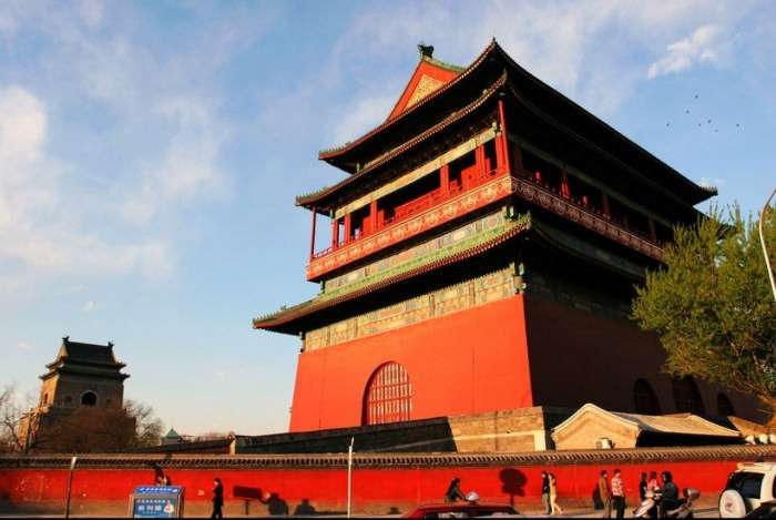)曰二更;11時至此次01時(子時)曰三更;1時至3時(丑時)曰四更;3時至5時(寅)曰五更;五時(申末卯初)曰亮更,即天明之意。定更及亮更,皆先擊鼓,后撞鐘。而二更至五更則只撞鐘不擊鼓。擊鐘鼓時先快擊十八響,再慢擊十八響,俗曰:“緊十八,慢十八”,快慢相間計六次,共108響。元代鼓樓在大都中心,原名齊政樓,取齊七政(日、月、金星、木星、水星、火星、土星)之義,其位置在明清鼓樓以西,今舊鼓樓大街南口。明永樂十八年營建北京,重建鐘鼓樓。