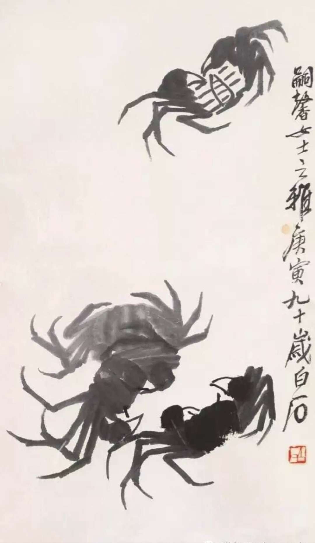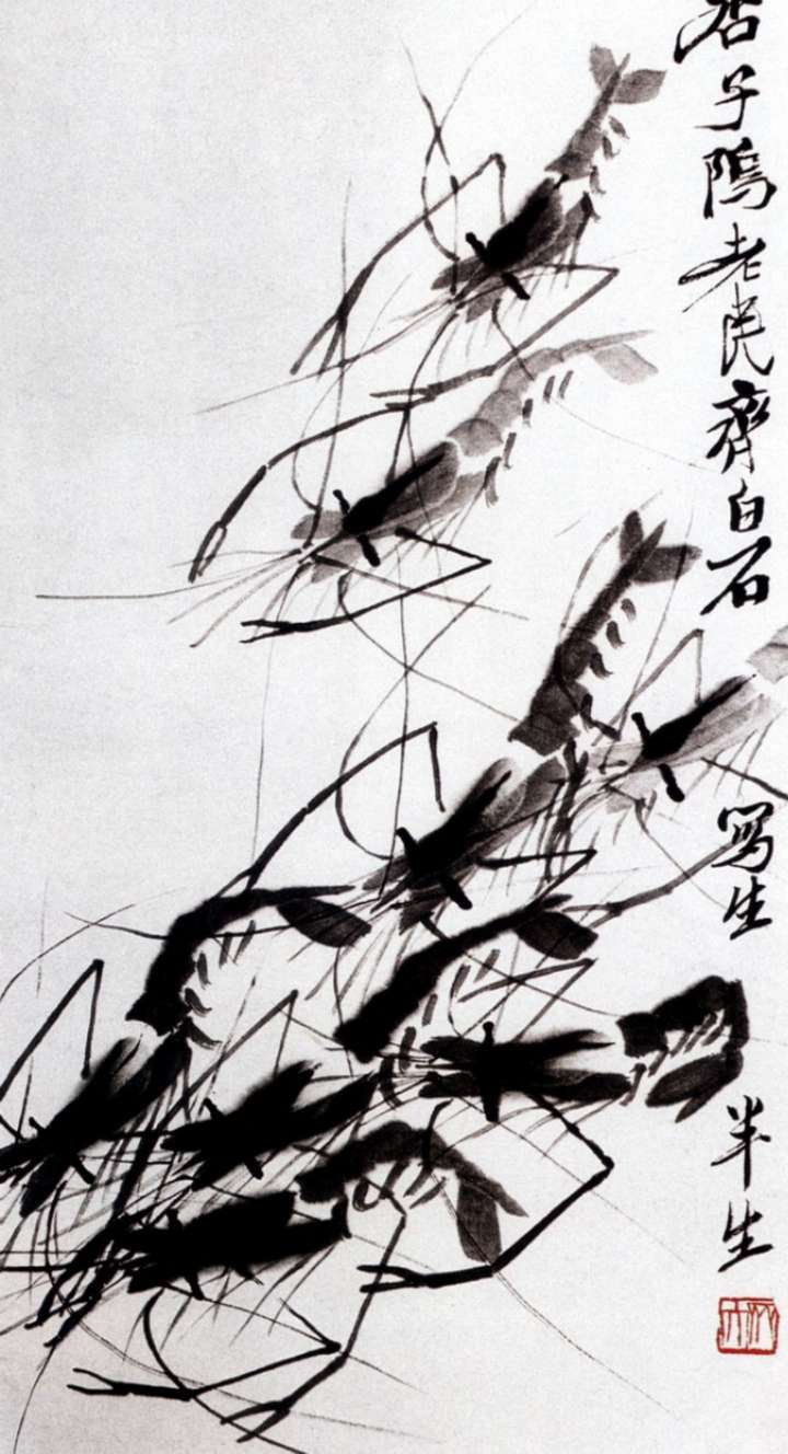 齊白石擅作花鳥蟲魚。畫的蝦更是出神入化,濕漉漉的,宛在水中,靈動活潑,神韻充盈。為了畫得逼真,他在一只大海碗里,養了幾只活蝦,放在案頭。作畫之前,先盯上半天,仔細觀察它們的體態、顏色、爭斗時的姿態。然后,研磨鋪紙,作起畫來,不僅把蝦的身體結構表現得細致入微,而且把蝦身體的彈性都表現得充滿力量,其長螯的勁力和觸須的柔順處理得相映生輝。蝦眼和蝦腦上的重筆,干濕用得更是恰到好處,令人叫絕。
