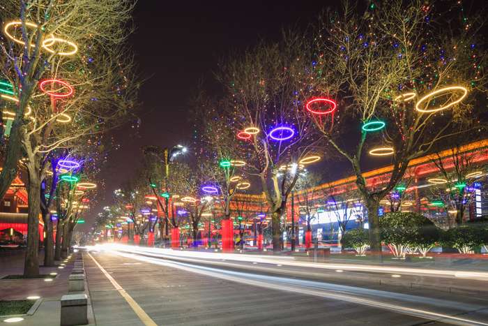 廣場上8根朱紅LED蟠龍柱高20米,柱頭直徑8.9米,柱身直徑2米,東西兩側各有四柱,取意為四方、四極、四周、四海,與八數相合,意為四面八方、四通八達,完美地詮釋了大唐不夜城的建筑美學,使得開元廣場成為了一個露天宮殿,每位置身其中的游客仿佛回到鼎盛王朝。當LED燈柱在古城夜色中點亮,不夜城更加煥發出“不夜”之魅。