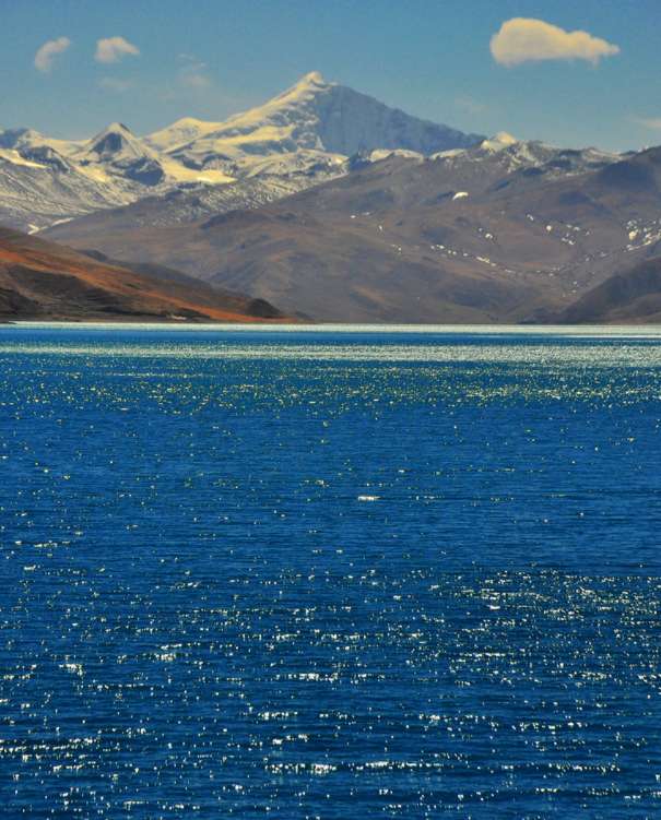 藏語意為“碧玉湖”、“天鵝池”,是西藏三大圣湖之一,位于雅魯藏布江南岸、山南浪卡子縣境內。湖面海拔4441米,東西長130公里,南北寬70公里,湖岸線總長250公里,總面積638Km2,大約是杭州西湖的70倍。湖水均深20-40米,最深處有60米,容積146億立方米,屬咸水湖,也是一個構造湖泊,是喜瑪拉雅山北麓最大的內陸湖。羊湖汊口較多,像珊瑚枝一般,因此它在藏語中又被稱為“上面的珊瑚湖”。雪峰悠然凌駕于圣湖之上的,是拉軌崗日山的主峰——寧金抗沙峰。拉軌崗日山是一條延綿約360多千米的山脈,它把雅魯藏布江和羊卓雍湖隔開,藏族人民把它的主峰叫做“寧金抗沙”,意思是“夜叉神住在高貴的雪山上”。寧金抗沙峰海拔7206米,地處江孜縣和浪卡子縣的交界處,是西藏中部四大雪山之一,它山體雄偉,危巖嵯峨,頂部尖錐突兀,坡嶺溝壑間的終年積雪發育了條條冰川,著名的卡若拉冰川就在它的南麓。
