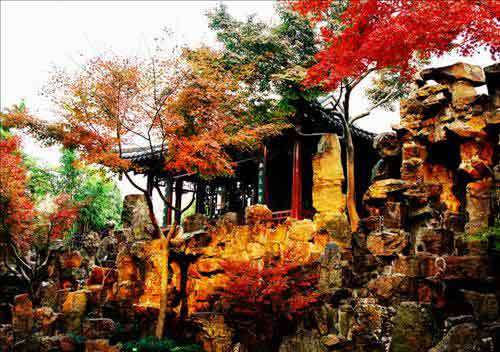 秋景是黃石假山,在園中東北角,用粗獷的黃石疊成。山頂建四方亭,山隙古柏斜伸,倚伴嶙峋山石。山上有三條磴道,一條兩折之后仍回原地,一條可行兩轉,逢絕壁而返。惟有中間一路,可以深入群峰之間或下至山腹的幽室。在山洞中左登右攀,境界各殊,有石室、石凳、石桌、山頂洞、一線天,還有石橋飛梁,深谷絕澗,有平面的迂回,有立體的盤曲,山上山下,又與樓閣相通。秋山山頂置亭,形成全園的最高景點。