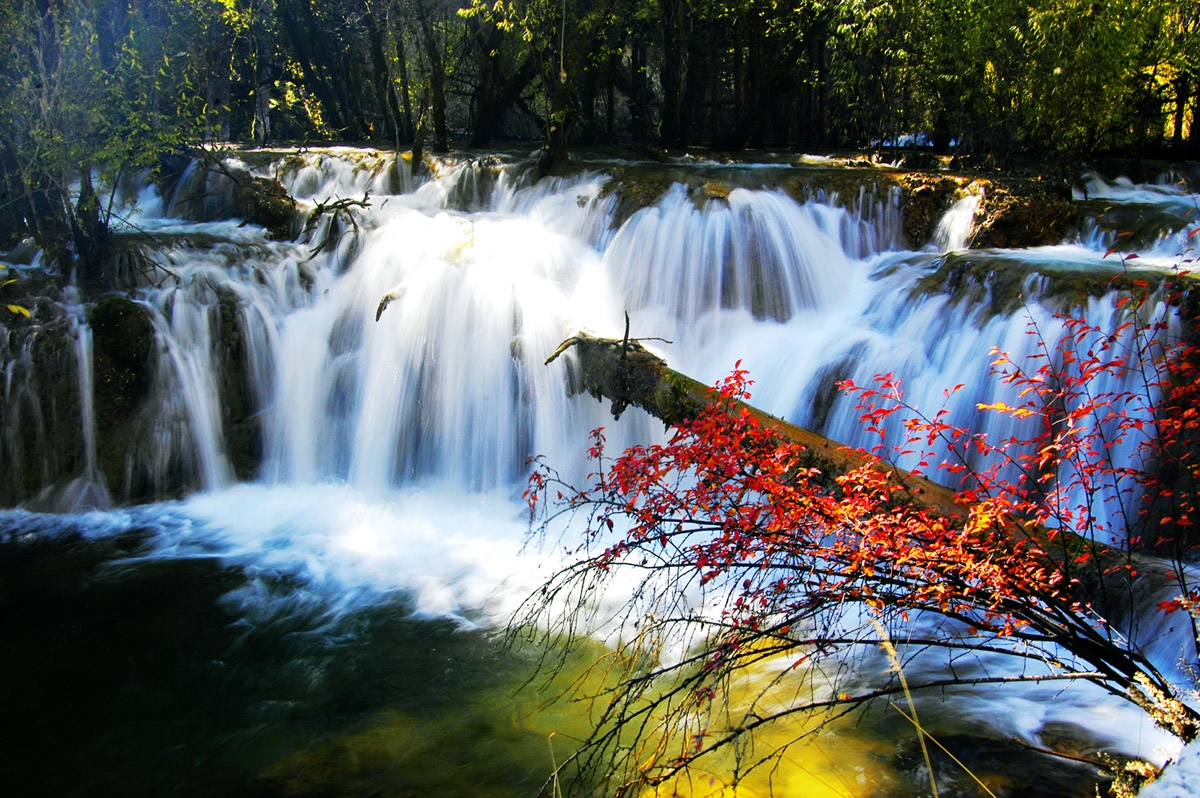 瀑布上游是湖泊,下游是階梯式河床,湖水從平臺流出,以每秒23米的流速經三級鈣華臺階跌宕而下,沖擊于巨大的鈣華石壁,形成巨幅瀑布,聲聞十里,如戰鼓擂動,如萬馬奔騰。彌漫山谷的水霧飽和著高濃度的負氧離子,使人心清神怡。