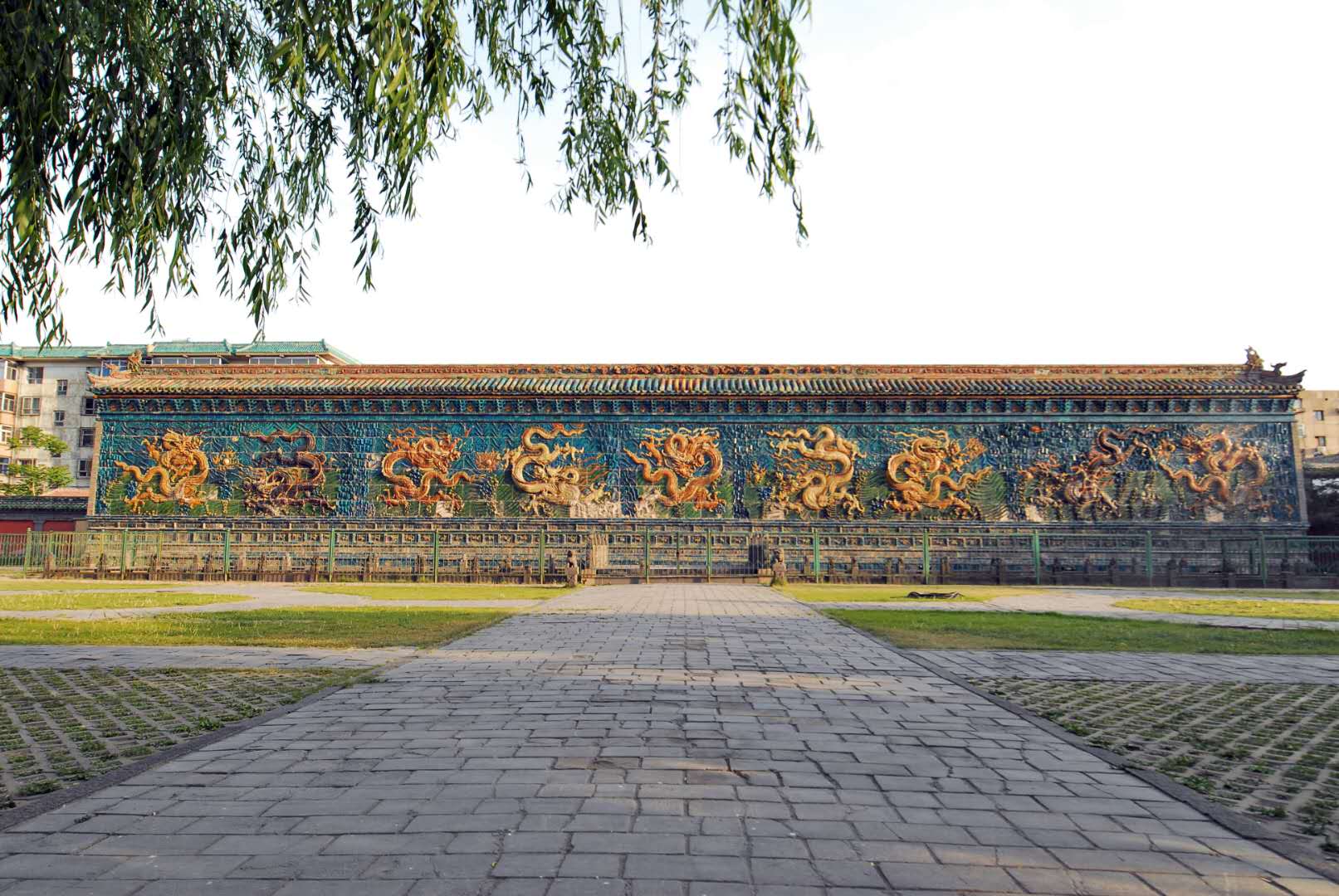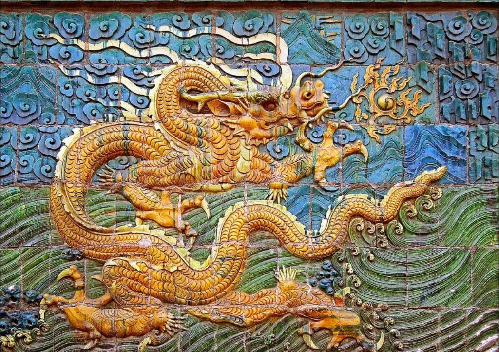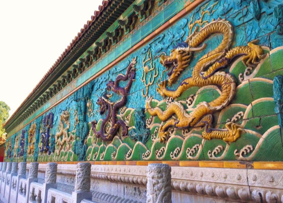 大同九龍壁位于山西省大同市城區和陽街,建于明代洪武末年,是明太祖朱元璋第十三子朱桂代王府前的琉璃照壁,距今已有600多年的歷史。壁高8米,厚2.02米,長45.5米。壁上均勻協調地分布著9條飛龍。兩側為日月圖案。壁面由426塊特制五彩琉璃構件拼砌而成。9條飛龍氣勢磅礴,飛騰之勢躍然壁上。龍的間隙由山石、水草圖案填充,互相映照、烘托。壁頂覆蓋琉璃瓦,頂下由琉璃斗拱支撐。壁底為須彌座,高2.09米,敦實富麗,上雕41組二龍戲珠圖案。腰部由75塊琉璃磚組成浮雕,有牛、馬、羊、狗、鹿、兔等多種動物形象,生動活潑,多彩多姿。