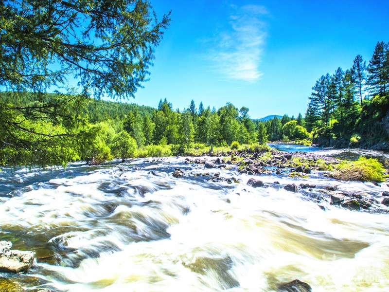 碧水似緩似急,悠風吹拂松林。只覺獨此一處,又感置身天境。