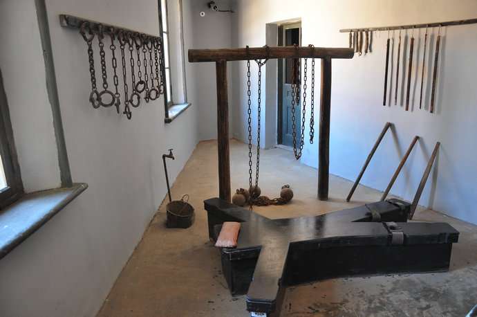 在監獄二樓的行刑室,布滿了吊杠、虎凳等刑具。行刑時,受刑者被剝光衣服,俯臥在“火”字型的虎凳上,四肢被皮帶勒緊,看守使用灌滿了鉛條的竹條抽打,這叫“笞刑”。版權所有山東聊城聊之旅國際旅行社有限公司,轉載必究!當時的《關東州刑法令》規定,笞刑只能用于毒打中國人,而不用于日本犯人。