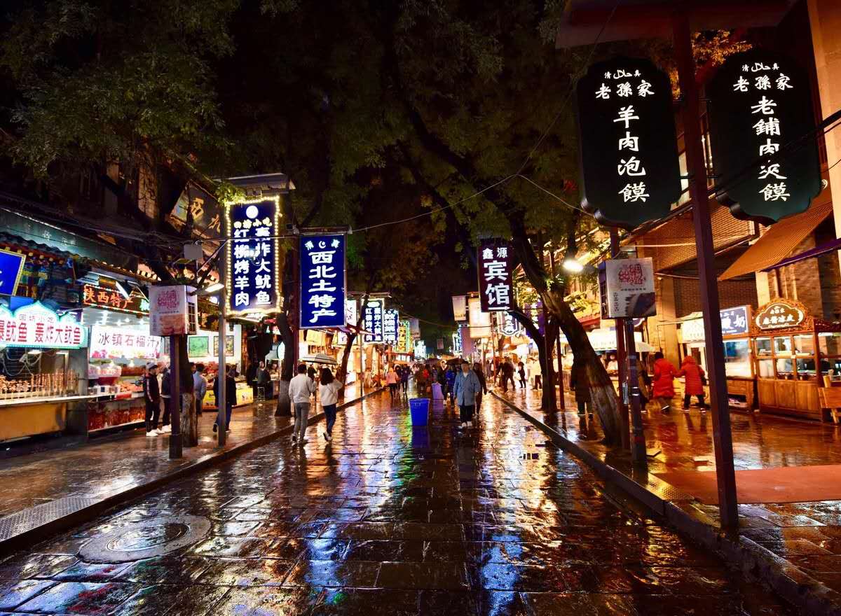 晚上的回民街有著與白天不同的精彩,整條街被濃厚的市井氣息籠罩,道路兩旁遍布掛著電燈、汽燈的各種攤鋪,主要販賣糕餅、干果、蜜餞、小吃。這些小攤后面則是許多經(jīng)營當?shù)仫L味小吃的飯館,人多時不光店里人