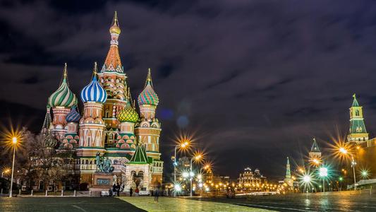 圣瓦西里大教堂于1553-1554年為紀(jì)念伊凡四世戰(zhàn)勝喀山汗國而建(由7個木制小教堂組成),并于公元1555年—公元1561年奉命改建為9個石制教堂,造型別致,多奇異雕刻,主臺柱高57米,為當(dāng)時莫斯科最高建筑。