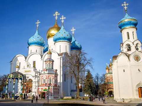 這里可以看到以畫《三位一體》而出名的俄羅斯畫家安德烈·魯布廖夫的壁畫作品等。他的作品《三位一體》本在此教堂收藏,現(xiàn)在收藏于莫斯科的特列季亞科夫畫廊。三圣大教堂的旁邊,是建于1477年的杜霍夫斯基教堂。教堂建筑奇特,由上下兩層構(gòu)成,下層是鐘樓,上屋是觀景臺。建于1682-1692年的白石磚砌齋房大廳,富麗堂皇,是舉行隆重宴會的場所。建于1741-1769年的五層鐘樓,高達88米,內(nèi)有掛鐘42口,是修道院建筑整體中最寶貴的部分,也是俄羅斯最美麗的建筑物之一。位于大修道院中央的圣母安息大教堂是在伊凡四世(雷帝)于1585年命令下修建的。在4個洋蔥頭型的藍色圓頂中央,有一個金色的大圓頂。是仿莫斯科的克里姆林宮的圣母安息大教堂而建的。教堂內(nèi)有l(wèi)7世紀的壁畫。 1920年,大修道院被列為國家歷史博物館保護區(qū),存有12-19世紀的應(yīng)用工藝品和18世紀的俄羅斯繪畫,還藏有各種民間藝術(shù)品,如木、石、骨雕、壁畫、紙彩畫、刺繡等。這里的圣水可是很有名的,每逢復(fù)活節(jié)、圣誕節(jié)等重大宗教節(jié)日,這里都有一番熱鬧景象。謝爾蓋三圣大修道院內(nèi)設(shè)有莫斯科宗教大學(xué)和神學(xué)院。在這里經(jīng)常能遇到身穿黑袍的年輕的修士和修女。