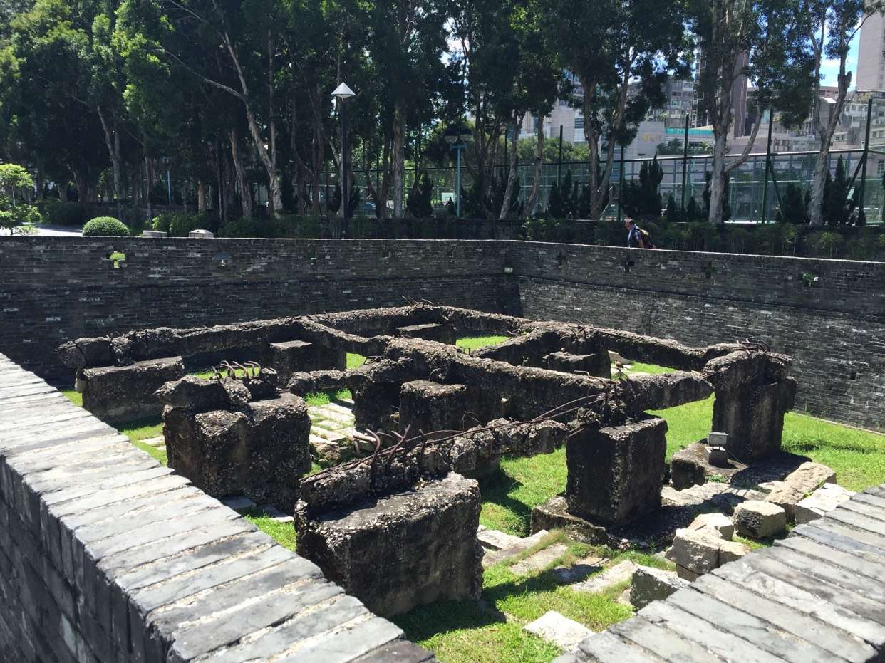越過衙府即到達寨城公園八景之一的南門懷古。“九龍寨城”于一八四七年建成,為加強防御,城墻上筑有六個瞭望臺;而另一道宛如萬里長城的副城墻,則沿北面山丘向上伸延。但“固若金湯”的石墻,在日治期間被日軍拆毀,石塊供擴建啟德機場之用。