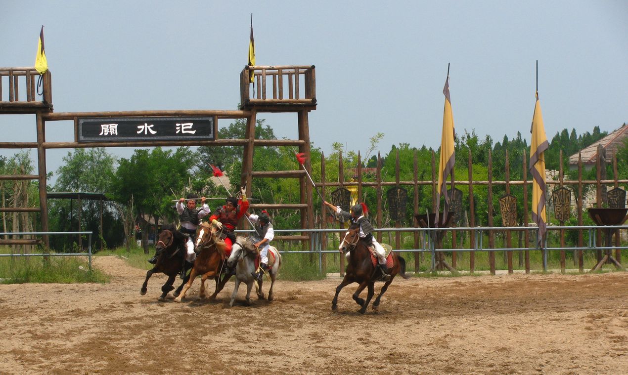 演武場總面積3600平方米,配有專業演員100余人,優良的新疆伊利馬40多匹。演員都是參加過電影《英雄》、電視劇《七劍下天山》的馬技替身演員,馬匹也都是訓練有素的名馬良駒。為游客獻上以西周歷史為背景的大型古代馬戰節目-王城保衛戰,和技術精湛、情節驚險刺激的馬術特技表演。觀看馬戰表演、馬術特技之余,游客還可以親身體驗縱馬奔馳、馳騁沙場的英雄氣概,和乘坐戰車巡城點兵、號令天下的王者風范。