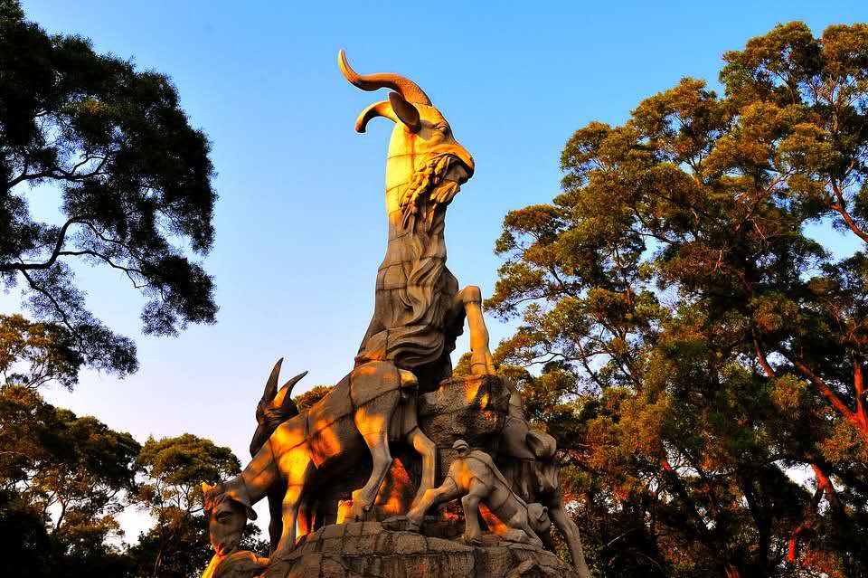 《五羊石像》整個石像連基座高11米。主羊頭部高高昂起,口中銜穗,回眸微笑,其余四羊環繞于主羊周圍,或戲耍,或吃草。五羊大小不一,姿態各異,造型優美,已經成為廣州城市的標志。