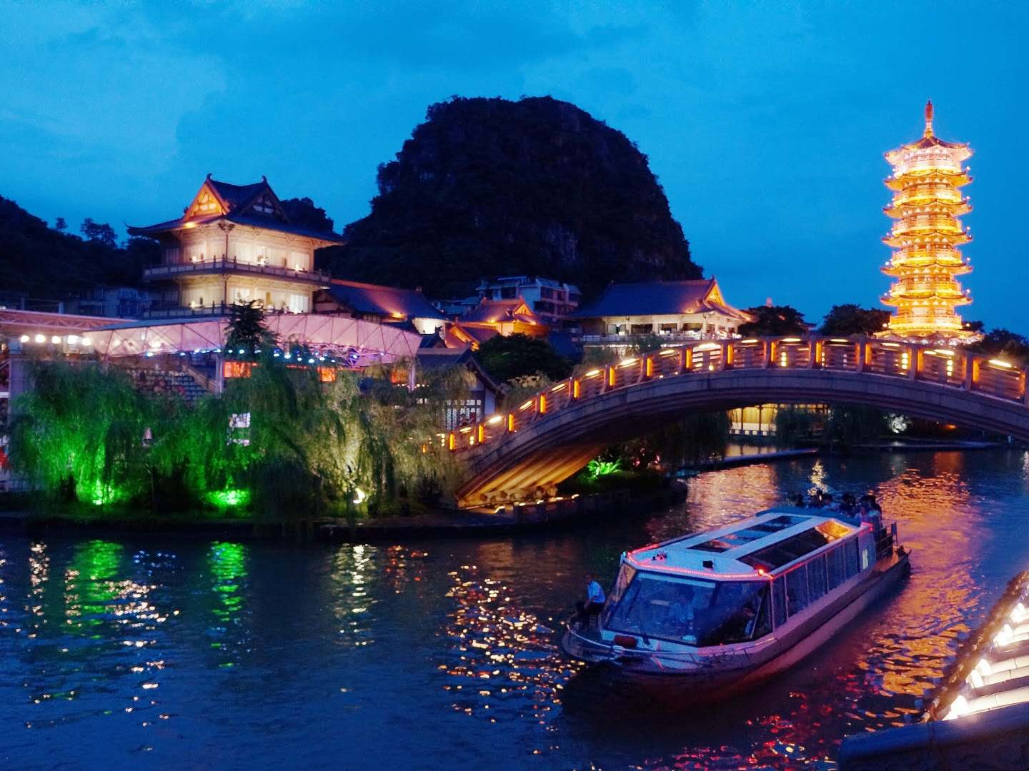 桂林的木龍湖,以前沒(méi)有的,為了兩江四湖環(huán)城水系,人工造了這個(gè)湖,漓江的水就是從這里流進(jìn)桂林市的,有了木龍湖,桂林市更美,桂湖、榕湖、杉湖的水活,清了,也更有魅力。木龍湖位于桂林市中山北路,是兩江四湖中建筑最別具一格的一段湖面,它是在老城墻東門城的依托下,參照清明上河圖等很多宋朝時(shí)期建筑改建而成的。由于后期建筑價(jià)格昂貴,也是四湖中唯一一處要買票進(jìn)入的湖面。木龍湖的位置,在宋代是一排排的兵營(yíng),這個(gè)人工湖因?yàn)猷徑君埗矗拭君埡君埶且陨虾K未凝埲A塔為藍(lán)本建造的,高45米。木龍湖這個(gè)湖是兩江四湖里最小的一個(gè),但是景色毫不遜色。極為美麗。