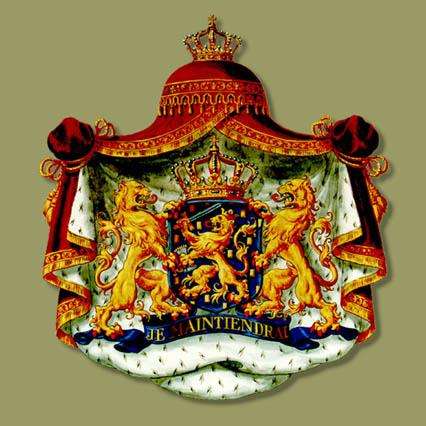 荷蘭國徽是一頂紅色貂皮懈”(Je Maintiendrai!)的藍(lán)色飾帶,兩只跨立的金獅翹著尾巴,口吐紅舌護(hù)著一面藍(lán)色盾徽。盾徽頂部是威廉一世御璽上所用的王冠;后面中央繪有一只頭戴王冠的金獅,右前肢揮舞著一把出鞘的利劍,左前肢揮動一束金色箭翎,它們象征著國王權(quán)力。華蓋如開啟的幕布,下部嵌有一條寫著威廉親王誓言“堅持不懈”。