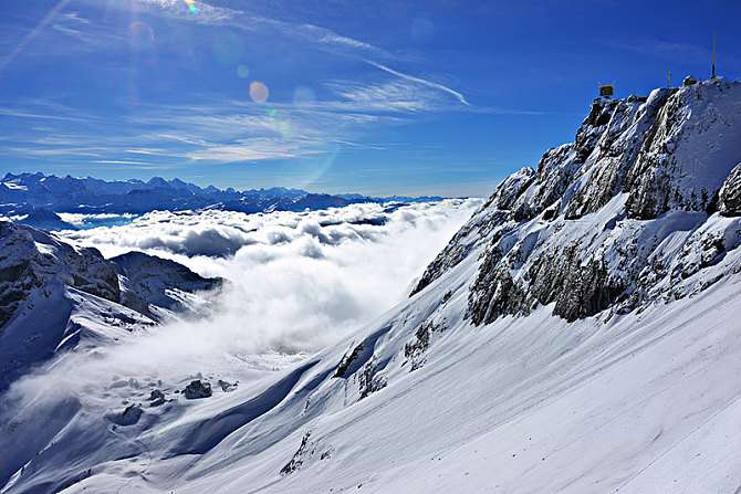 Alpnachstad以上的山體陡峭嶙峋,上山途中市場可以看見巖羊出沒,也是徒步愛好者喜愛的登山線路。熟練的登山者登頂需花費5-6小時。途中有一次機會在Aemsigen站搭乘登山列車。山頂有一家三星酒店Hotel Bellevue和一家位于百年歷史建筑里的精品酒店Hotel Pilatus-Kulm,數家餐廳,多功能廳,“龍之論壇”會議室,紀念品店,室內觀景長廊,室外觀景大露臺。喜愛徒步的游客,還可以沿山頂數條步行道登上最高點。在山頂的景色非常壯觀,令人心潮澎湃,贊嘆大自然的鬼斧神工:阿爾卑斯諸峰的雪頂漂浮在云端,仙氣飄飄;俯視,琉森湖和琉森老城盡收眼底;向北,可以看見數個翠玉般的湖畔,然后是蘇黎世,巴塞爾目力將直達德國黑森林。Kriens一側的山體比較平緩,有數個牧場。在Fraekmuentegg纜車換乘站有瑞士境內最長的旱地雪橇道(summer toboggan, 1.35公里)和瑞士中部最大的繩索攀爬樂園。冬季也可以在此租借雪橇椅,滑雪橇下行到Kriens站。