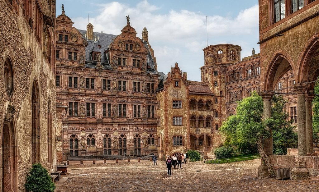海德堡城堡坐落于國王寶座山頂上,名勝古跡非常多,歷史上經過幾次擴建,形成歌特式、巴洛克式及文藝復興三種風格的混合體,德國文藝復興時期的代表作。