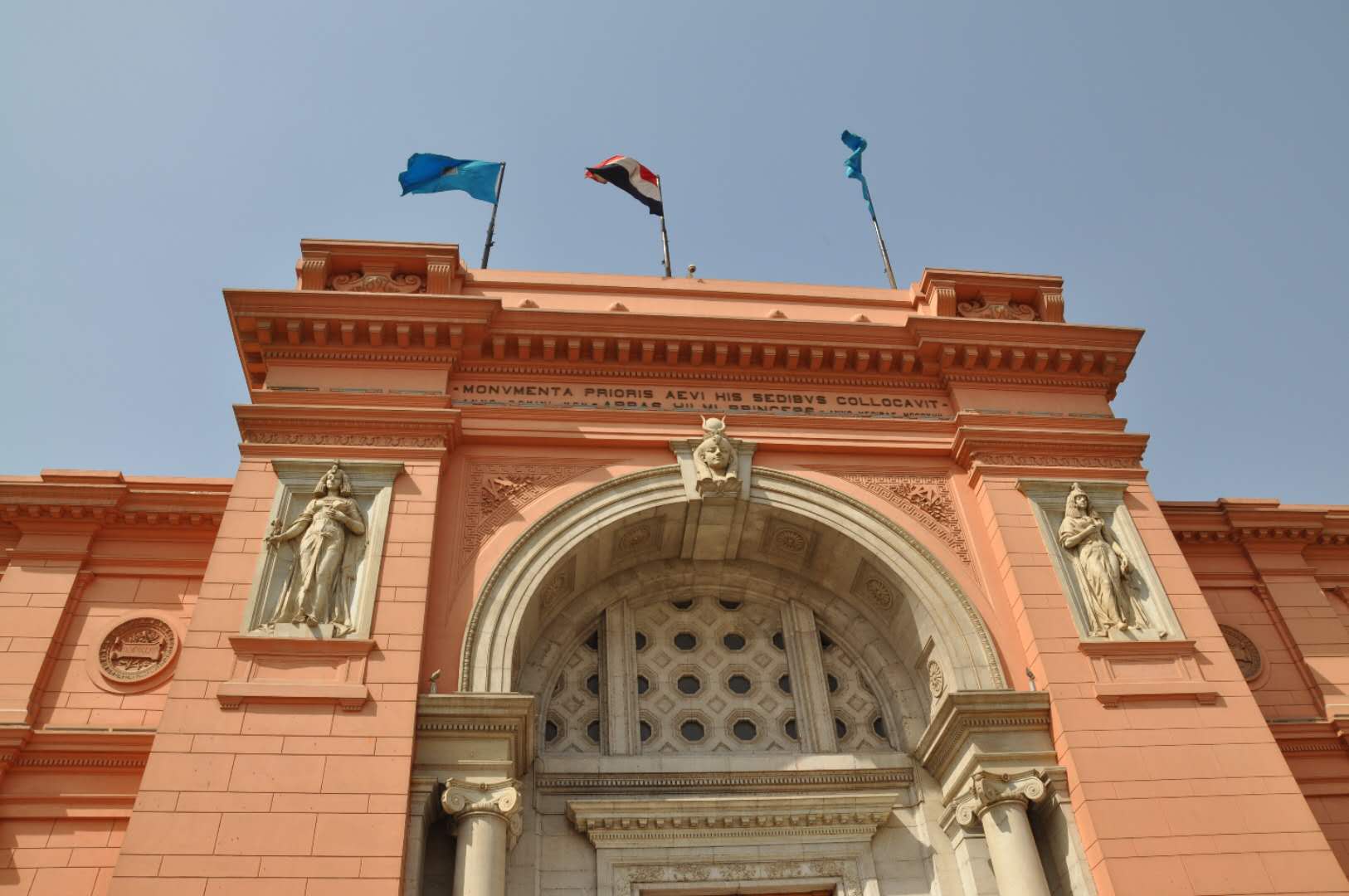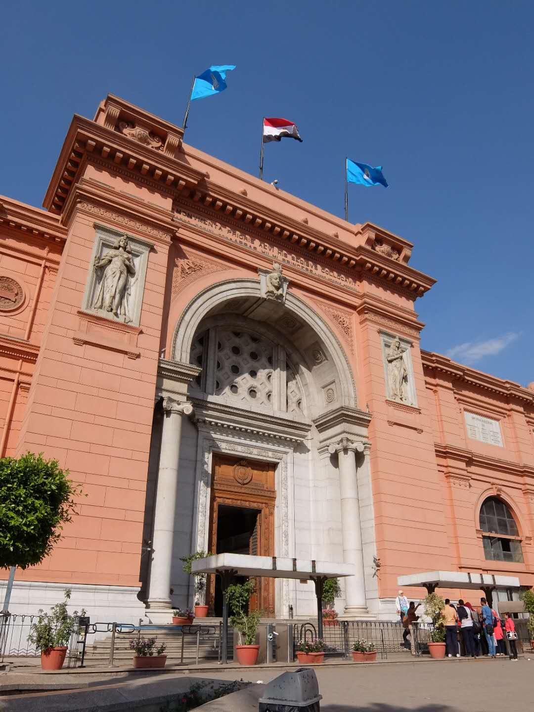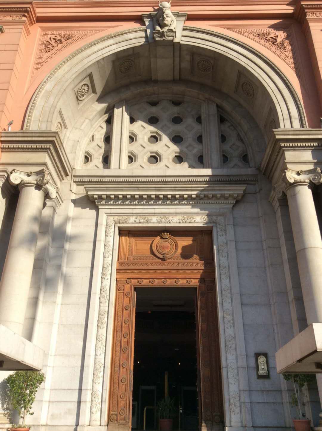 博物館入口的設(shè)計(jì)融入了古埃及藝術(shù)的特征:大門的外廓是一個圓形拱門,拱門兩側(cè)的壁龕中各有一個將法老形象歐式化的浮雕,其中一個持有紙莎草,另一個持有蓮花,分別象征古代埃及的南北方。