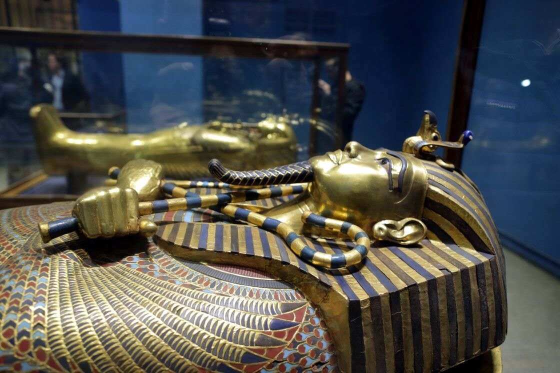 第18代法老王朝圖坦卡蒙陵墓中出土的1700余件文物,其中有金質(zhì)御座、黃金面具、黃金棺、黃金飾物,圖坦卡蒙及王后的精美淺浮雕像,法老的輦車,兵車和狩獵用彎弓,鑲嵌象牙和彩色玻璃的家具,王后的珠寶首飾和衣箱等。