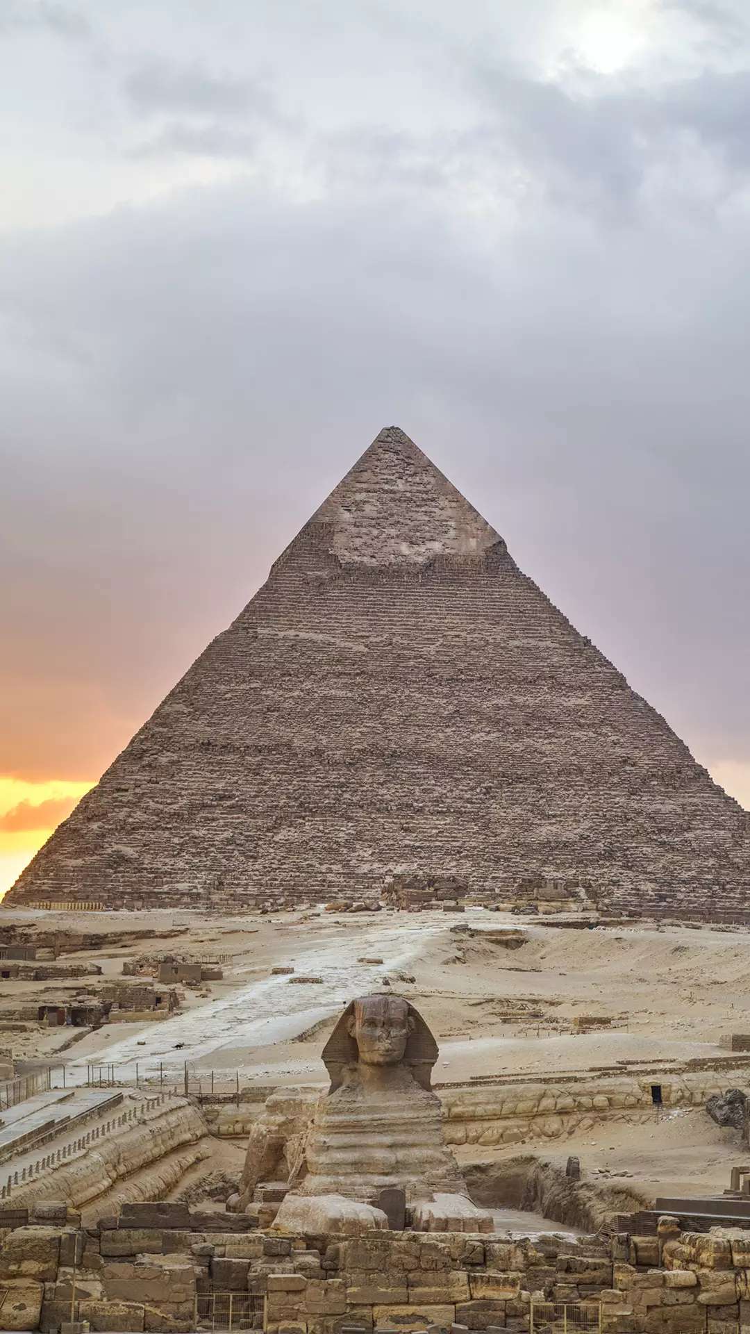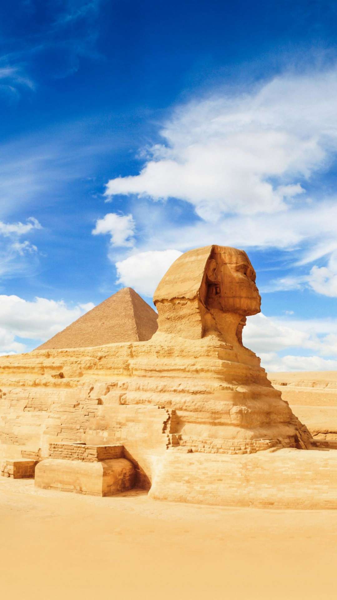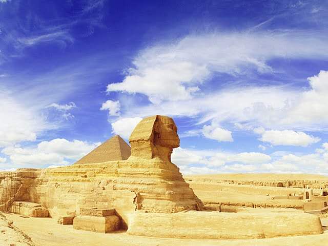 獅身人面像(又譯“斯芬克斯” sphinx)坐落在開(kāi)羅西南的吉薩大金字塔近旁,是埃及著名古跡,與金字塔同為古埃及文明最有代表性的遺跡。像高21米,長(zhǎng)57米,耳朵就有2米長(zhǎng)。除了前伸達(dá)15米的獅爪是用大石塊鑲砌外,整座像是在一塊含有貝殼之類(lèi)雜質(zhì)的巨石上雕成。面部是古埃及第四王朝法老(即國(guó)王)哈夫拉的臉型。相傳公元前 2611年,哈夫拉到此巡視自己的陵墓——哈夫拉金字塔工程時(shí),吩咐為自己雕鑿石像。工匠別出心裁地雕鑿了一頭獅身,而以這位法老的面像作為獅子的頭。在古埃及,獅子是力量的象征,獅身人面像實(shí)際上是古埃及法老的寫(xiě)照。雕像坐西向東,蹲伏在哈夫拉的陵墓旁。由于它狀如希臘神話(huà)中的人面怪物斯芬克斯,西方人因此以“斯芬克斯”稱(chēng)呼它。