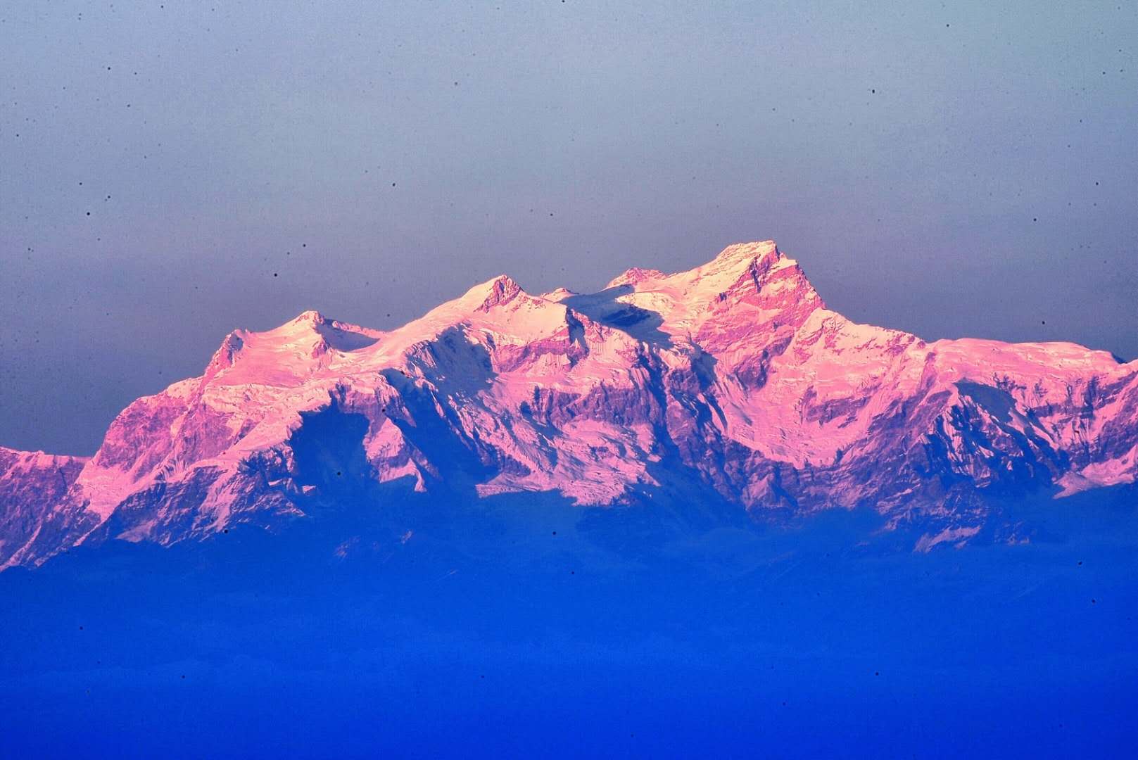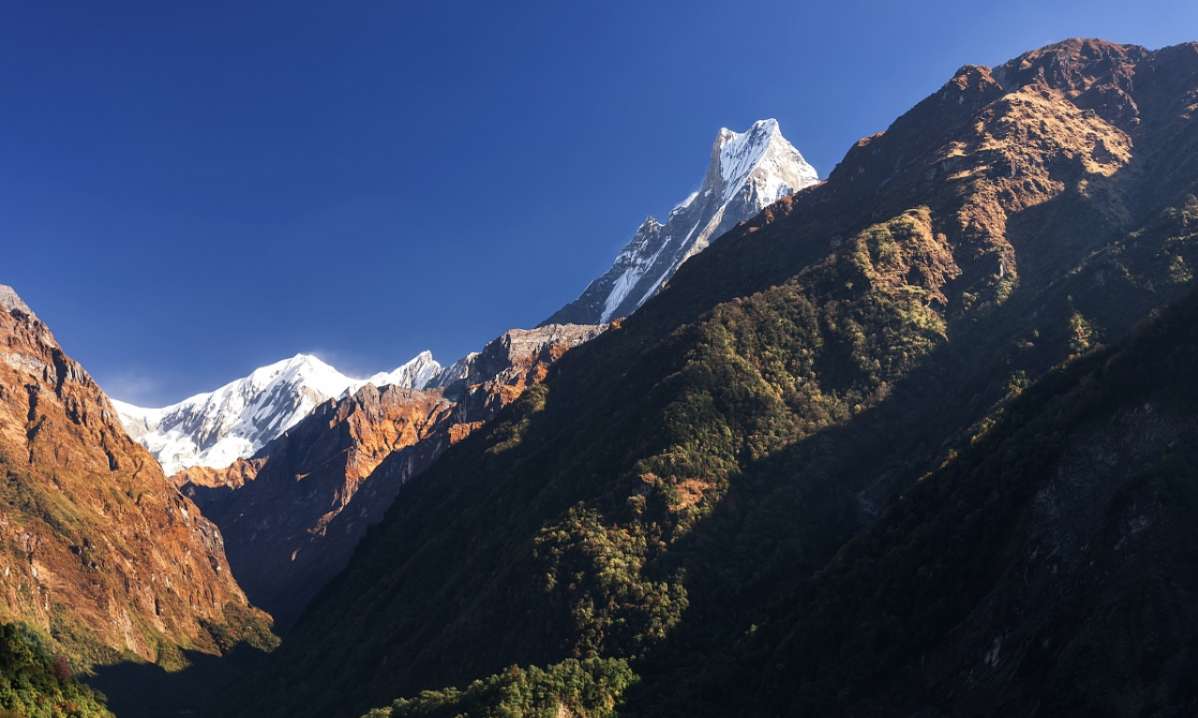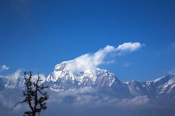 魚(yú)尾峰雖然不是尼泊爾最高的山峰,但卻成為尼泊爾的標(biāo)志。從波卡拉的費(fèi)娃湖附近,可以看到這座圣山和周圍峰群,突出于較低的山巒之上。