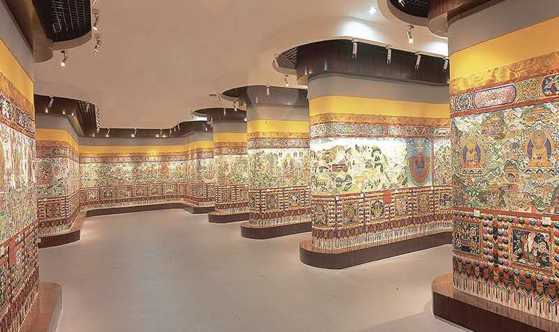 青海藏醫(yī)藥文化博物館整體結(jié)構(gòu)共分三層。一、二層設(shè)有藏醫(yī)史、曼唐器械、古籍文獻、藏藥標本、天文歷算、彩繪大觀等六大展廳;負一層建有班智達藏藝展銷精品城。各大展廳根據(jù)不同的展示內(nèi)容,通過環(huán)境再現(xiàn)、唐卡雕塑、文物展示、高科技模擬等方式和手法,突出特點,各具風格,展示了中國藏醫(yī)藥文化博大精深的豐富內(nèi)涵。