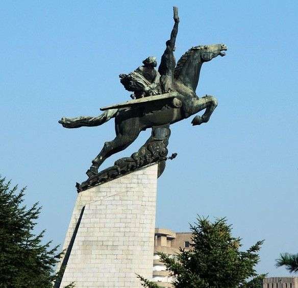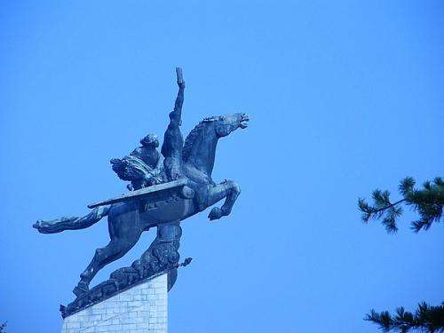 朝鮮千里馬銅像矗立在萬壽臺(tái)的丘崗上,是1961年4月 15日,在偉大領(lǐng)袖金日成同志的49壽辰之際建立的。座基是用360多種2,500多塊不同規(guī)格的花崗巖壘起來的,銅像為一匹伸展雙翅的騎有工人、農(nóng)民的 “千里馬”。