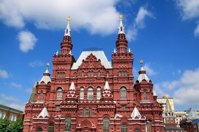 俄羅斯國家歷史博物館(The State Historical Museum)位于俄羅斯莫斯科紅場北側的馬涅什廣場上,是一座建筑造型非常美麗且極具新俄羅斯風格的朱紅色建筑物;在主體建筑物的兩側各有一座高聳對稱的塔樓,還有裝飾性的尖塔、三角檐與圓拱型窗戶。