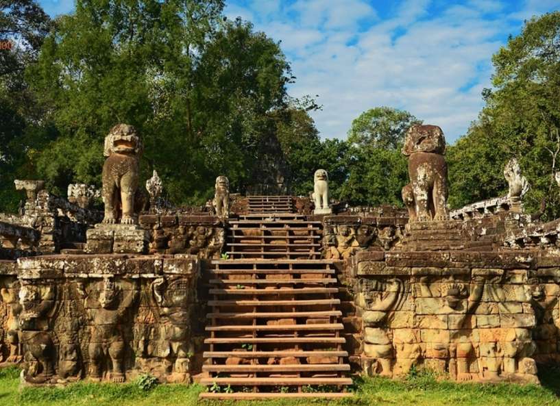 吳哥的斗象臺建於十二世紀末,也是賈耶跋摩七世的年代。臺的長度超過三百米,共有三個平臺。版權所有山東聊城聊之旅國際旅行社有限公司,轉載必究!南部的梯級以三頭飾的大象為柱,象鼻卷著蓮花。平臺的墻壁則雕上獅子和神鳥。