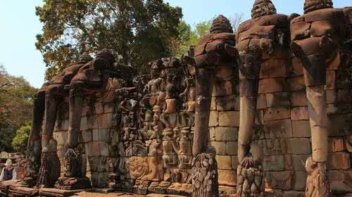 斗象臺(Elephant Terrace)出了巴戎寺繼續往北走,不遠處就到了斗象臺。這里是吳哥國王選坐騎的地方,周邊的圍墻上雕有許多大象和印度教的神像,有些雕像都還很完整,可以看出當時精湛的藝術造詣……