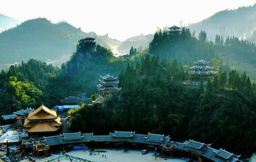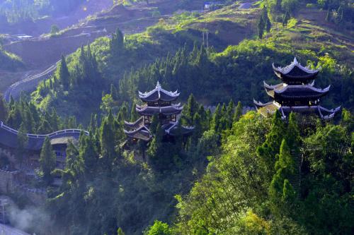 九黎宮:科學利用山水自然資源,因地制宜、依山造勢,順山而居。宮高99米,呈11開間,象征九九歸一之意。建筑由四合院到吊腳樓到?jīng)_天樓三合為一,九黎宮內(nèi)有苗族接龍?zhí)谩駱腔⒖谔谩⑺暮显骸俗殖T和吊腳樓群等多種文化符號,是彭水展示苗族文化、民風民俗的博物館,是目前最大的吊腳樓群。