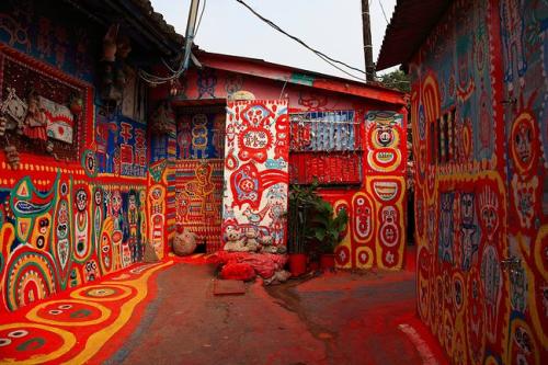 起源于住在臺中市南屯區嶺東科技大學附近有一處舊眷村的八十七歲老榮民黃永阜,因為「無聊」而拿起畫筆彩將眷村內的巷弄街道當成了天然的畫布,在上頭彩繪了各式美麗的彩虹線條與可愛動物,不僅染亮了小村,在網路上引起熱烈討論,更形成一股參訪風潮。黃永阜先生86歲時開始作畫,他用自己手中的畫筆在眷村老舊的房屋和街道上勾勒出一個色彩斑斕的童話世界。老人最初只是在自家的屋里屋外用畫筆描繪心事,打發時光。后來不少鄰居被他充滿童真的畫所吸引,也邀請他去作畫,就這樣老人在無意中創造了一段色彩繽紛的傳奇。如今,他所居住的位于臺中市春安里的眷村被人們賦予了一個好聽的名字:“彩虹眷村”,并成為了當地的熱門景點,每年吸引約50萬人前來參觀,而香港籍退伍老兵黃永阜則被人們親切地稱為“彩虹爺爺”。走進“彩虹眷村”,地面上、墻壁上畫滿了色彩艷麗、造型俏皮的兔子、小雞、猴子、小鳥、卡通人物、花朵、太陽以及彩虹等。紅色、黃色、藍色、綠色、白色,絢爛的色彩和極富想象力的線條,讓人們馬上置身于童話世界中。村口那條數十米長的巷道是“彩虹爺爺”作畫最多的地方,也是最熱鬧的地方。這里的畫色調明艷、熱烈,地上用油漆涂成了紅底,上面用白色和黃色等勾勒出小鳥、小雞和兔子等造型;墻上則分區塊時而以藍色為背景、時而以白色或黃色為背景,上面畫了數百卡通造型的猴子、貓和孩童。