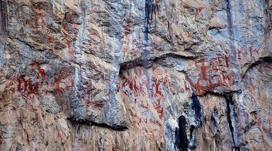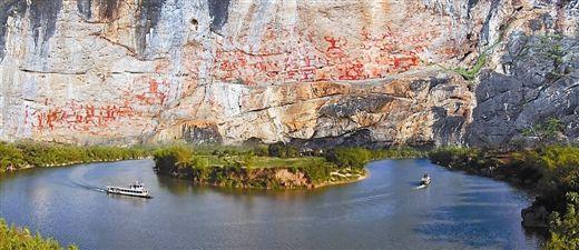 這些圖像在崖壁上錯綜呈現,組成一幅幅完整的圖畫——典型的組合是一個高大魁偉、身佩刀劍的正身人像居中,腳下有狗,身旁有銅鼓,四周有眾多動作一致的側身人像。整個場面布局規整,疏密相間,動感十足,極像一場莊嚴又歡快的祭祀活動。這些色彩鮮艷、不斷重復的畫面,與山崖、河流和臺地共同構成了神秘而震撼的文化景觀,被稱為“崖壁畫的自然展覽宮”、“斷崖上的敦煌”。